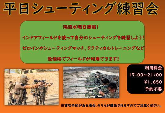 開催日:毎週水曜日 開催時間:17:00~21:00 料金:2,500円 備考:貸切予約がある場合は貸切が優先されますご注意ください。 時間内であれば 2,500円で練習し放題 当イベントはご予約は必要ございません。 ※フィールドご利用状況はご予約状況カレンダーをご確認ください。