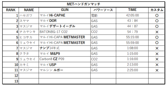 ハンドガン祭の時に開催されたハンドガンMET戦タイム計測結果となります。