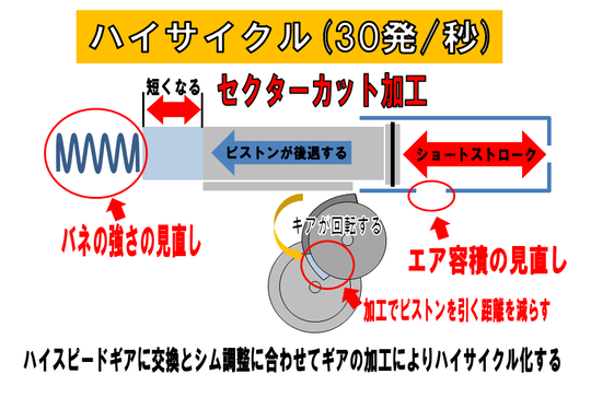 秒間30発というサイクルを実現させる為、バネの強さだけでなく、エア容積などやパーツ強度を見直す事によって飛距離UPと驚異的なサイクルを生み出します